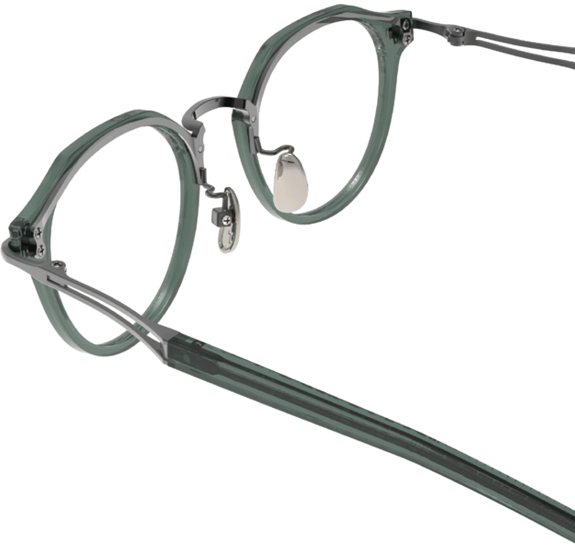 採用された「ダブルSラインテンプル」は、流れるように描かれた2本のカーブが頭部をやさしく包み込み、安定したフィット感を生み出します。掛け外しの動作もスムーズに行え、長時間の着用でも側頭部へストレスを感じにくい設計です。滑らかなアセテートでカバーされ、金属がお身体に合わない方でも安心して着用ができ、日常に自然と溶け込む快適さを生み出しています。