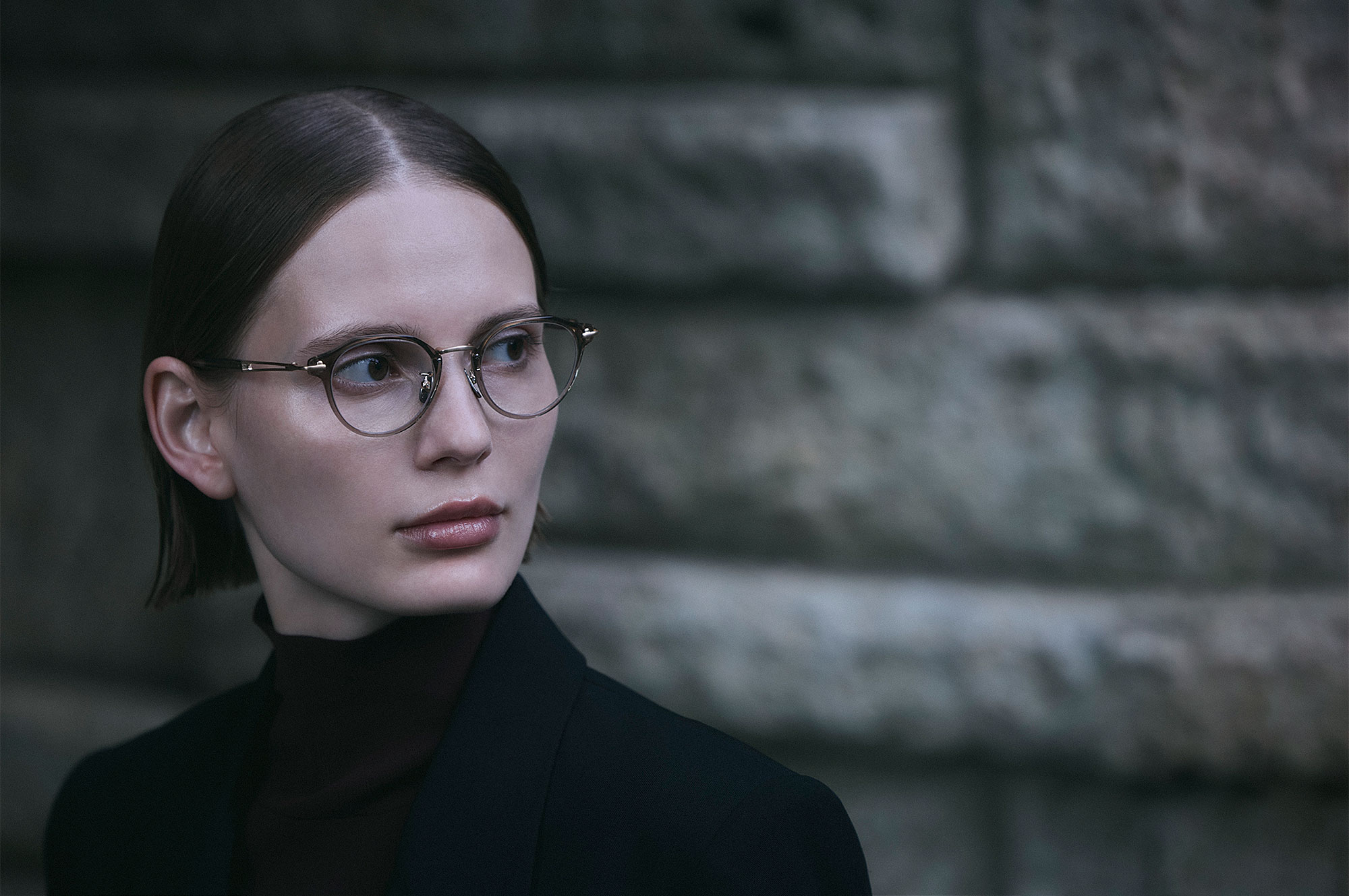レンズサイズは目元に余分な隙間が生まれない44mmに設定し、正円ではなくわずかに歪みを持たせています。これにより、ラウンド特有の難しさを感じさせず、絶妙なバランスを描き出します。小さすぎると鋭い印象に、大きすぎるとコミカルになりやすいラウンドですが、ファイはその微妙なニュアンスを捉えています。